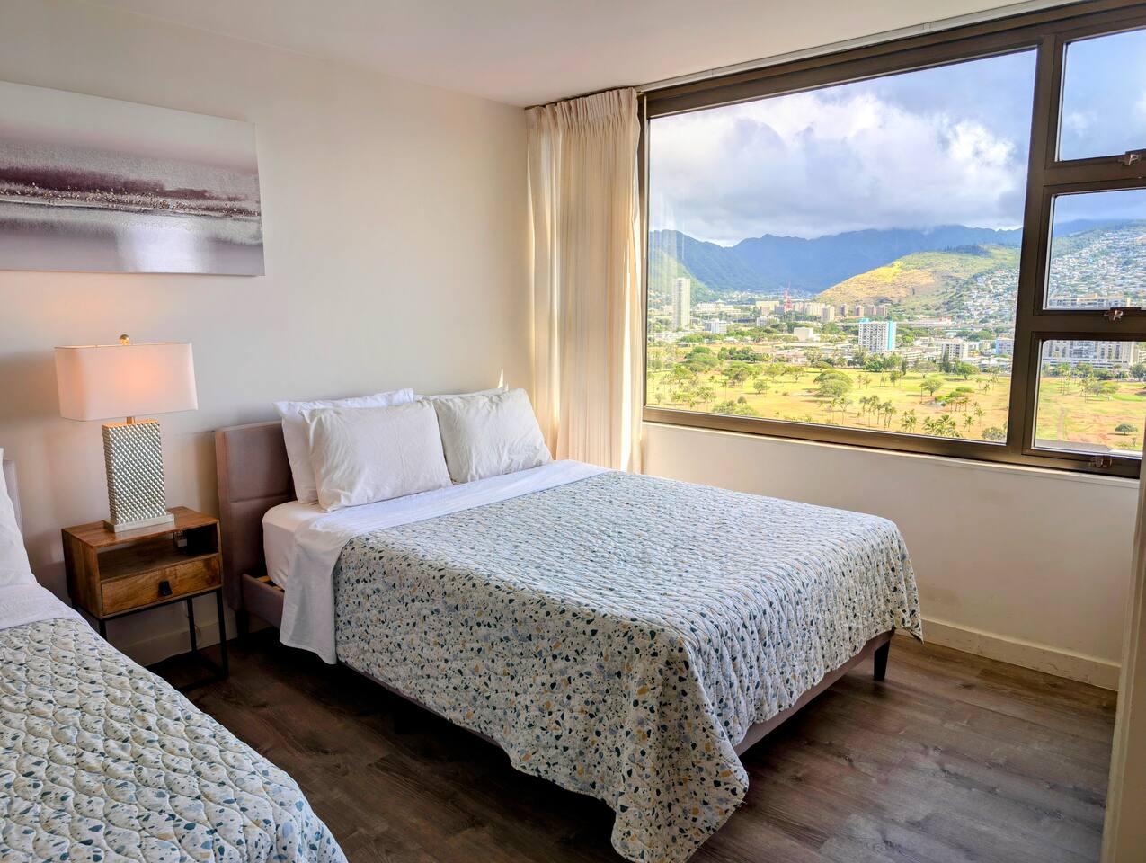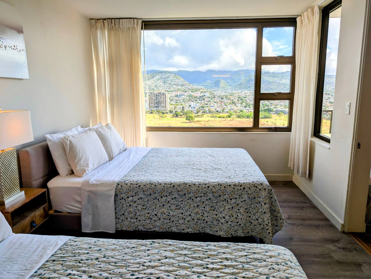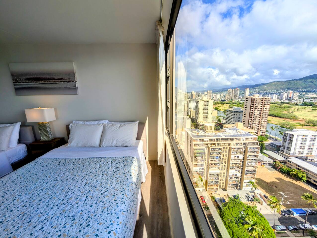 This cozy unit at Waikiki Banyan is designed to provide a comfortable stay. The bedroom features a queen bed and a full size bed with 100% cotton linens and ample closet space. The living area includes a sofa bed, and a flat-screen TV with cable channels. Step out onto the private balcony to enjoy the mountain and city view! The dining area has a table and chairs for four, and the fully equipped kitchen includes a refrigerator, microwave, basic cooking utensils, and dishware. There is a sink for dishwashing. The unit also comes with window air conditioning and high-speed internet access.