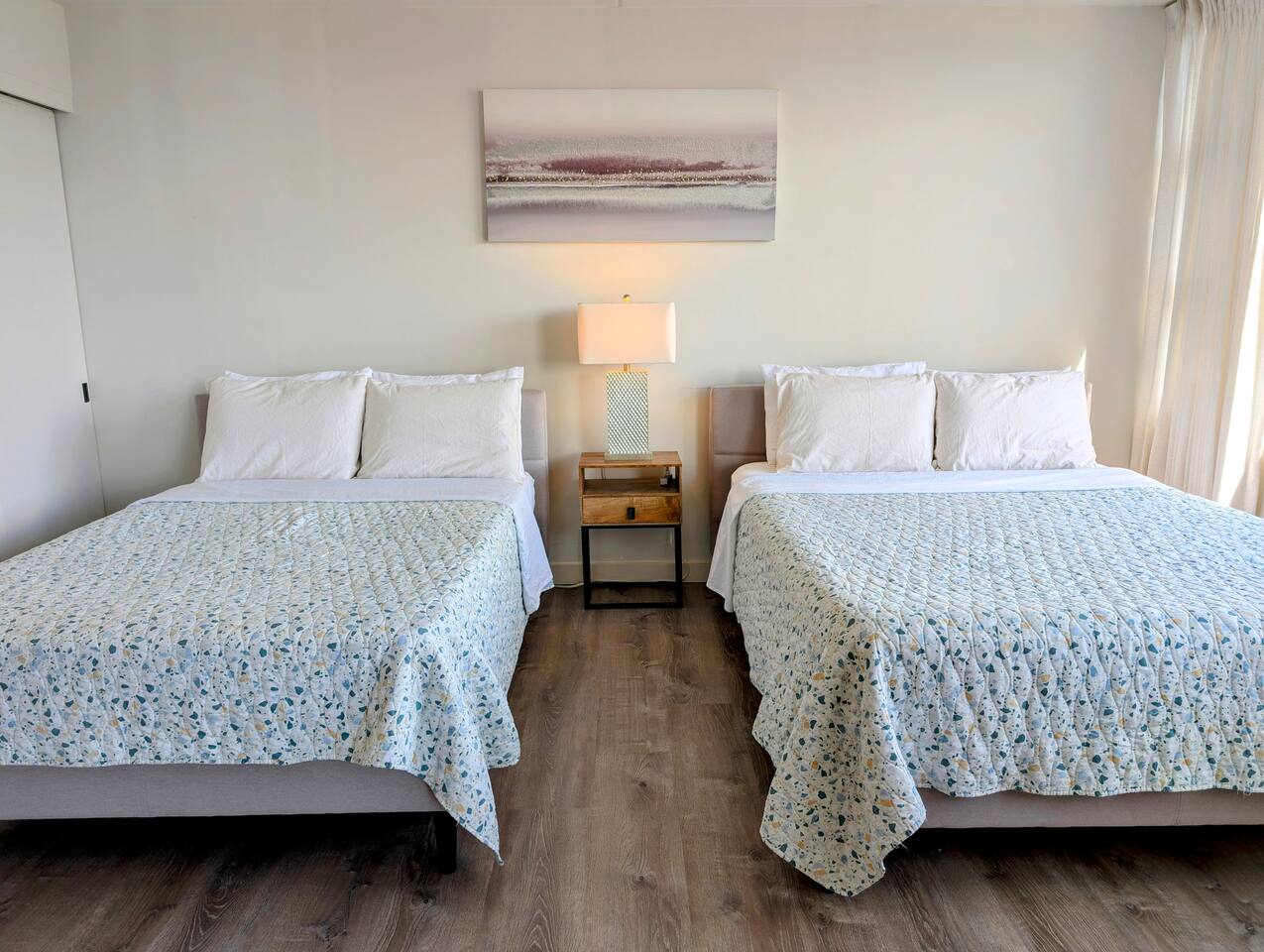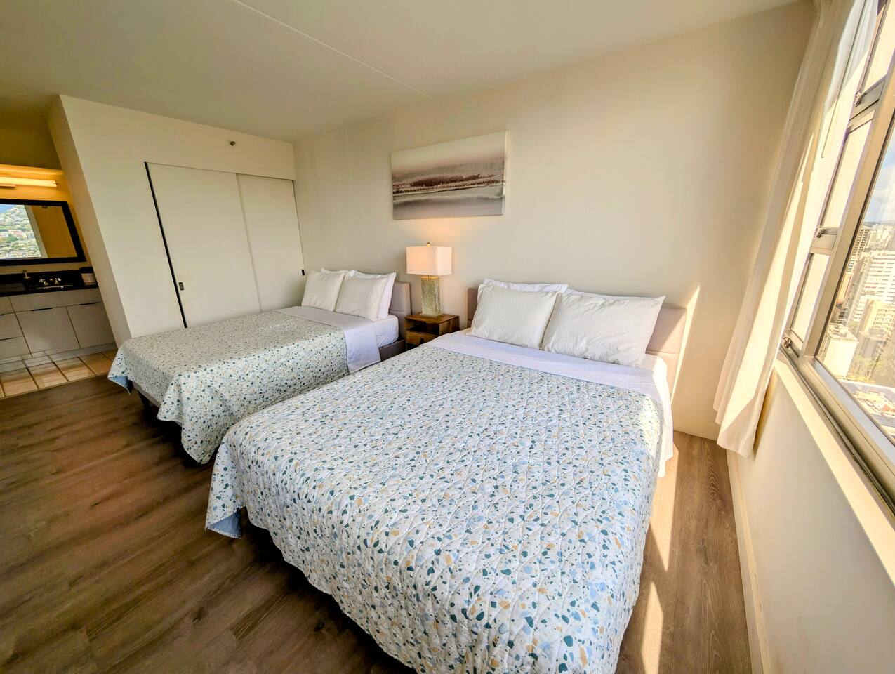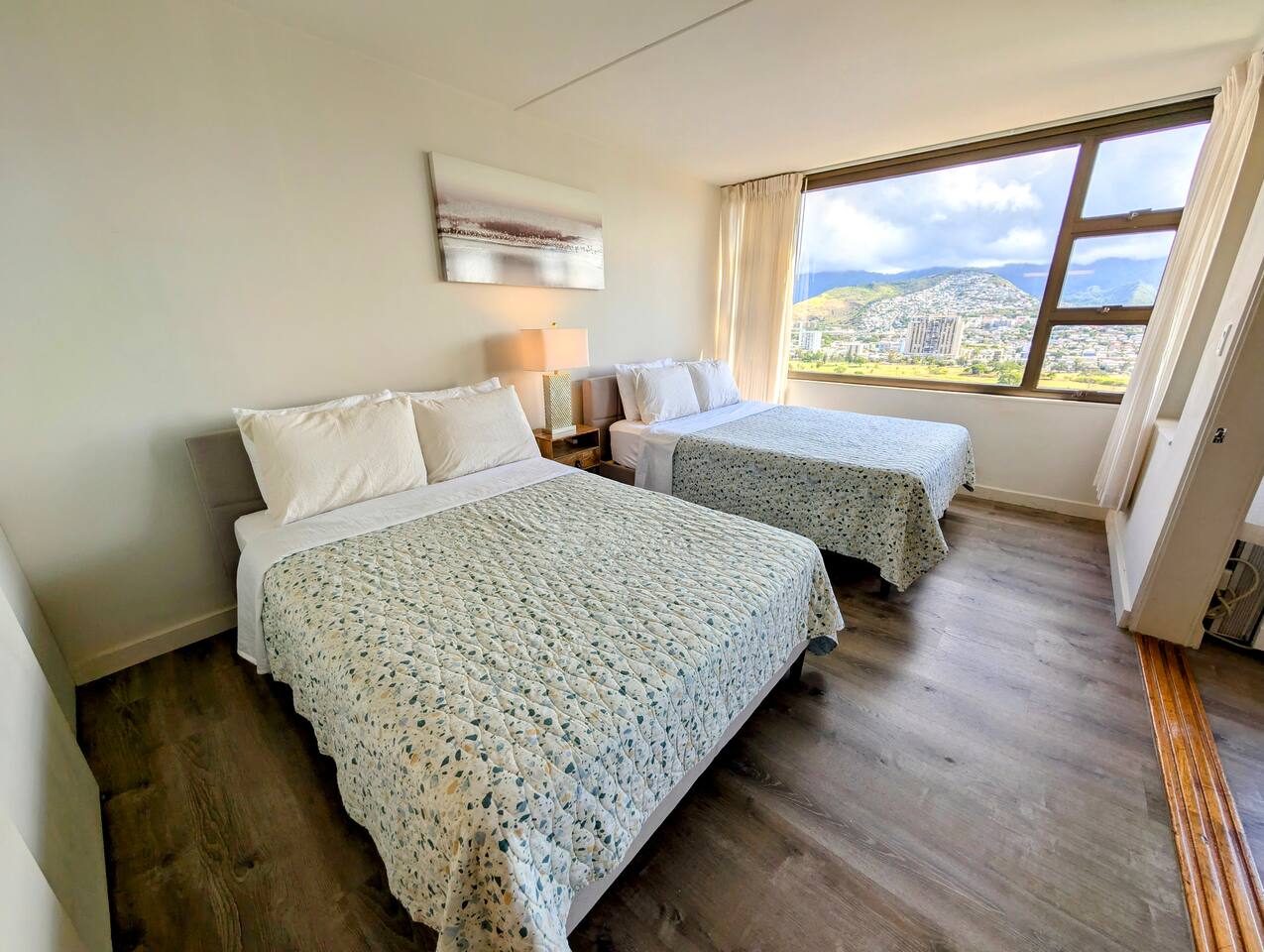 This cozy unit at Waikiki Banyan is designed to provide a comfortable stay. The bedroom features a queen bed and a full size bed with 100% cotton linens and ample closet space. The living area includes a sofa bed, and a flat-screen TV with cable channels. Step out onto the private balcony to enjoy the mountain and city view! The dining area has a table and chairs for four, and the fully equipped kitchen includes a refrigerator, microwave, basic cooking utensils, and dishware. There is a sink for dishwashing. The unit also comes with window air conditioning and high-speed internet access.
